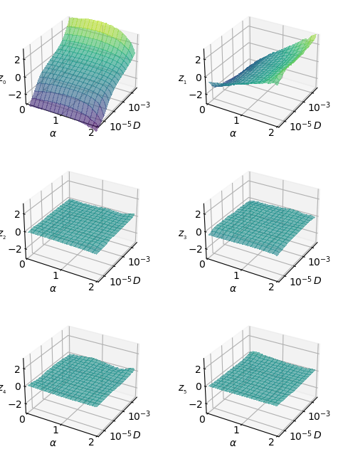 ax.tick_params(axis='z', which='major', direction='in')In the following generation tutorial, we will observe how selecting values from the latent neurons, we can generate trajectories that exhibit these relationships with \(\alpha\) and \(D\).