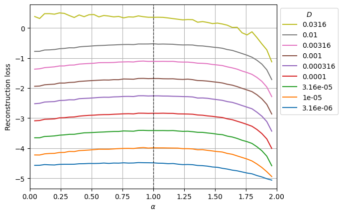 The following plot shows the mean reconstruction loss per \(\alpha\) and \(D\).