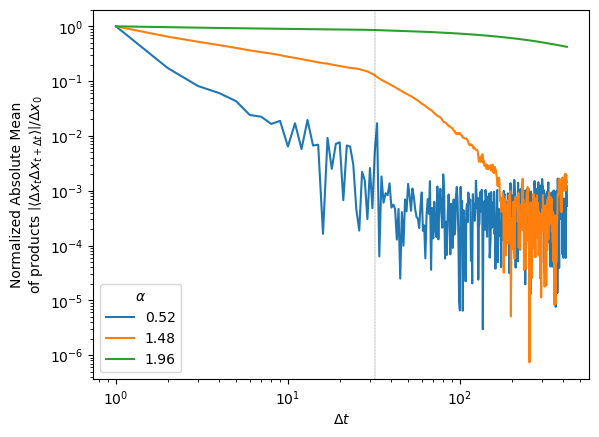 r" $\left|\langle \Delta x_t\Delta x_{t+\Delta t} \rangle\right|/\Delta x_0}^2$");
