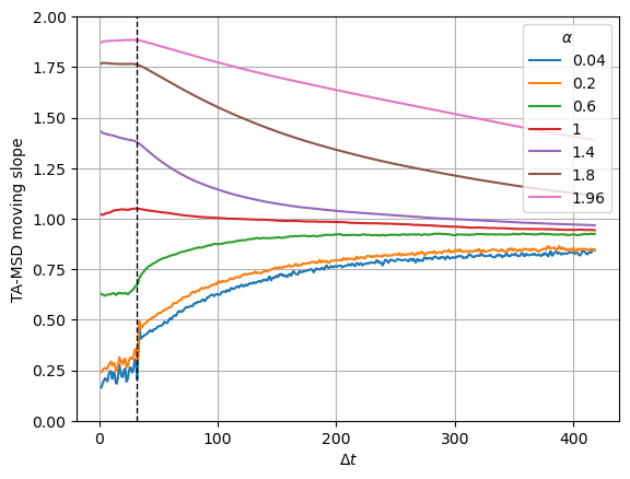 We analyze the slope of the TA-MSD from the lengthy generated trajectories.