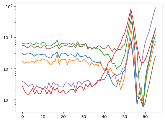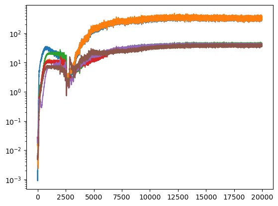 After training, we observe a good reconstruction loss around -2.36, while the \(D_{KL}\) is on the order of one for two neurons and the rest are three orders of magnitude below. We say that two neurons survive while the rest are noised out. We will see in the analysis tutorial how these two neurons encode the minimal relevant information to generate the trajectories.